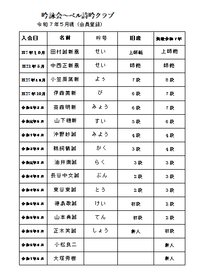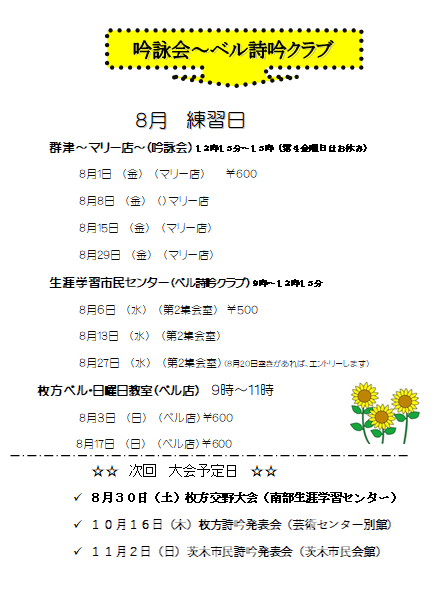 ●2025年 〜(練習予定日) 吟詠会 ベル詩吟クラブ ☆皆さんご自由に、見学下さいお待ちしてます 京阪電車の郡津駅下車、3分、マリー店毎週金曜日12時〜15時まで 枚方生涯学習交流センター5F 9時〜12時30分まで ☆☆ ご自由に、気楽にお越しくださいおまちしてます ![]() 今年は参加煮の、希望が沢山おられえるので、早に申し込みお願い します、締切日8月15日です、よろしくお願いします、 |